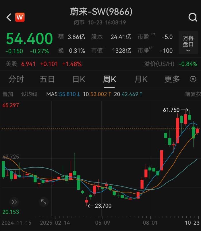 汽车销量的上涨,也带动了蔚来股票的上升。8月1日蔚来港股大涨8.62%,从后蔚来港股一路拉升,截至10月23日收盘,每股报54.4港元,较7月31日收盘涨56.32%,总市值1232亿港元。