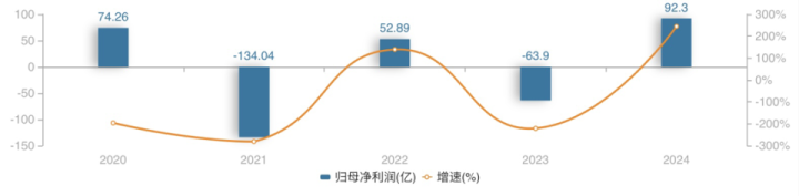 Wind数据显示,2020年至2024年,公司归母净利润分别为74.26亿元、-134.04亿元、52.89亿元、-63.90亿元和92.30亿元,对应各年的同比增速分别为-46.83%、-281%、139%、-221%和244%。